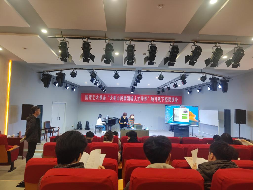 3月18日下午,国家艺术基金“大别山民歌演唱人才培养”线下授课课堂在我校beat365唯一官方网站一楼八音讲堂如期进行。大别山民歌传承人,信阳市民歌研究会副主席李鸣凤老师应我校邀请,为学员授课,参与实践课的还有韩冰副教授和张梦晗老师。