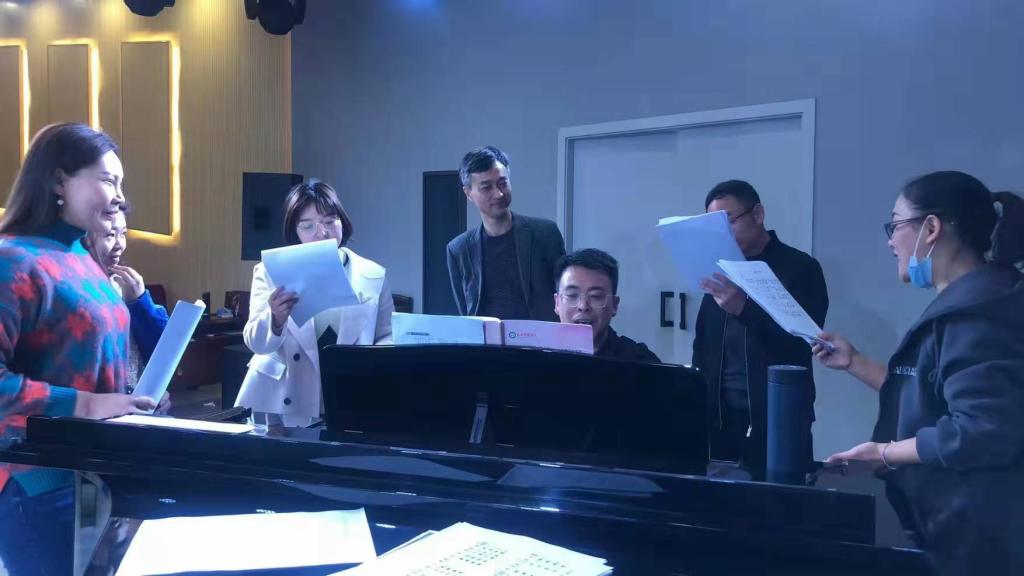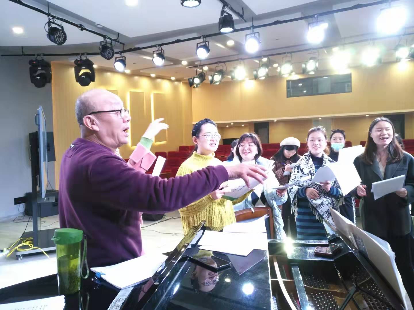 为高质量完成大别山民歌汇报音乐会,3月23日下午,在信阳市音乐家协会主席,信阳民歌研究会会长刘宏奎和信阳市音乐家协会理事,信阳市民歌研究会副主席李鸣凤带领下,学员们在beat365官网一楼八音讲堂进行了紧张有序的排练。彩排过程中,刘宏奎主席根据传统民歌的特点,从作品的速度和节奏、方言的准确性、情绪的把握和演唱形式等多方面进行了细致的处理,尤其是在语言上,刘宏奎主席统一了在演唱中的咬字问题,表示要用当地的方言演唱并亲自示范了歌曲中的方言读白部分。李鸣凤副主席强调了演唱中的倚音问题,要准确的把倚音演唱出来,才能更加贴近民歌的味道。