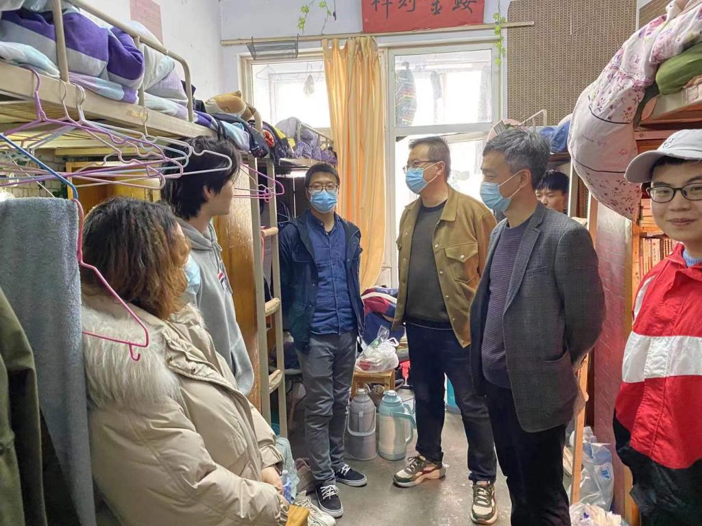 为抓好疫情防控工作,了解学生思想动态,3月24日下午,学院党委书记周文勇,院长陈新宇,副书记雷玲及全体辅导员深入宿舍看望学生。