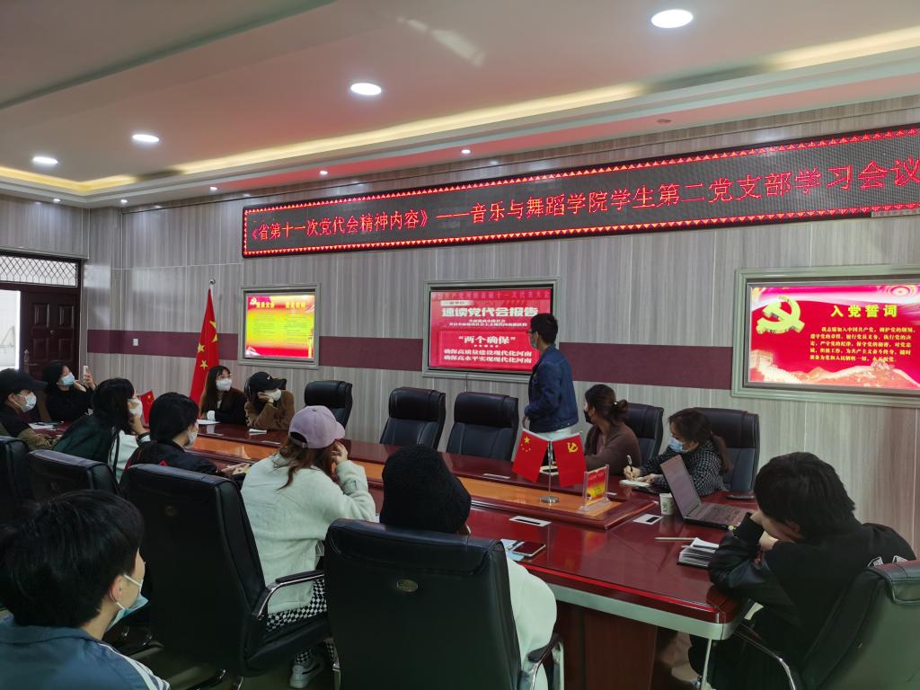 各支部党员在支部书记的带领下认真学习了楼阳生在大会上所做的报告,领悟了会议精神。学生第一党支部支部书记唐晓云在学习会上强调,党代会确立的工作目标、进行的工作部署,通篇体现了对习近平总书记寄予河南“奋勇争先、更加出彩”殷殷嘱托的回应和落实,具有高度的前瞻性、系统性和科学性。党代会报告提出,要把创新摆在发展的逻辑起点、现代化建设的核心位置。青年大学生是创新的生力军和突击队,要有创新意识、创新勇气和创新能力,要对照新目标、新任务、新要求,发挥敢闯敢试、敢为人先的特色,不断增强开拓创新的能力。楼阳生书记报告中明确提到要“推动文化繁荣兴盛,提升发展软实力”,作为艺术专业的大学生,要主动担当作为,坚定文化自信,学好基本功,提高专业素养,潜心创作优秀的文艺作品。