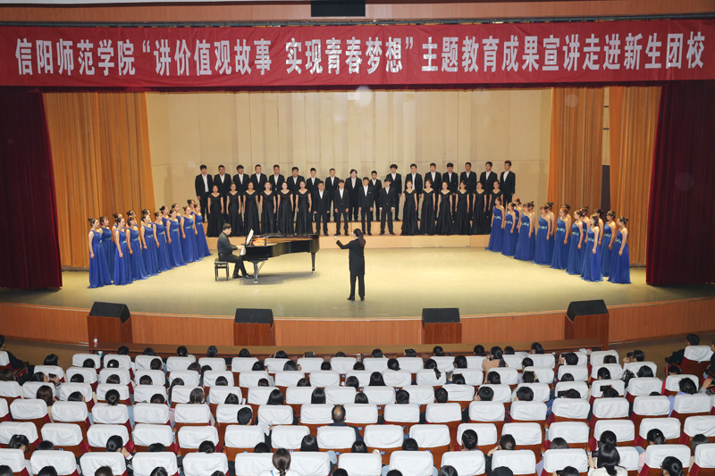 活动开始前播放了讲价值观故事宣传片。在合唱《在灿烂的阳光下》中正式拉开帷幕。《一路向东》热情讴歌了红军战士大无畏的牺牲精神和坚定不移跟党走就能夺取革命胜利的坚强意志。《杜鹃花开烈女崖》用晏春山的故事突显了中华儿女为革命事业无畏牺牲的精神,深深表达了对革命先烈的敬佩和感激之情。《担当者》深情讲述了郸城县中学校长张伟的感人事迹,教育引导广大青年团员向榜样学习,向模范致敬,要无私奉献。舞蹈《映山红》将活动氛围推向高潮。《心是大海,爱是朝阳》讲诉了盲人特教老师郭朝阳从教二十余年,身残情深、以爱执教,让盲童感受到家的温暖,引导学生健康成长,让人肃然起敬。《红田》讲述了赤诚的革命志士们为了革命事业英勇献身,并对取得最终胜利充满信心的英雄故事。《一颗红心永向党》讲述了革命先烈徐海东的一生,让全场师生深深体会到徐海东为党为国为人民的赤胆忠心。《梅生苦寒溢人清香》将我校刘梅生教授将满腔热情和忠诚献给教育事业、献给党的故事娓娓道来,让人心生敬仰。《红军干娘周家姆》《高干子弟》等一个个故事,教育引导青年团员要积极践行社会主义核心价值观,不忘初心,牢记使命,发扬艰苦奋斗的精神,坚定信心埋头苦干奋勇争先,努力把自己培养为德智体美劳全面发展的时代新人,为建设成高水平师范大学贡献青春智慧和力量,把革命先烈为之奋斗、为之牺牲的伟大事业奋力推向前进。