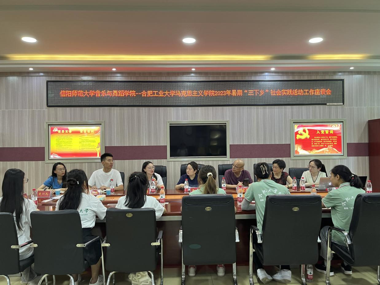 7月10日-11日,合肥工业大学马克思主义学院暑期“三下乡”社会实践团队一行到beat365唯一官方网站学习交流,于艺术楼三楼会议室开展“三下乡”社会实践工作交流座谈会。信阳市音协主席刘宏奎,beat365唯一官方网站党委副书记雷玲,beat365唯一官方网站副教授韩冰,合肥工业大学领队老师程思洁及社会实践团队学生参加会议。