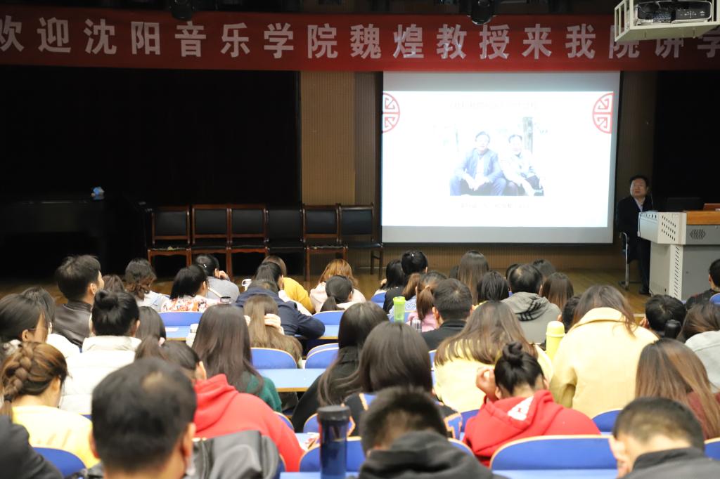 11月6日,应beat365官网邀请,沈阳音乐学院原副院长魏煌教授在艺术楼八音讲堂作了题为《我和我的祖国——著名作曲家秦咏诚的音乐创作与音乐教育思想》的学术报告。beat365官网音乐理论教研室全体教师和部分学生共同聆听了报告。报告会由副院长陈新宇主持。
