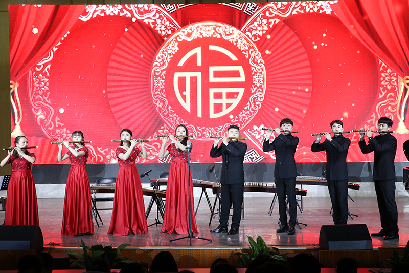 本场音乐会特邀河南歌舞演艺集团副总经理、演出总监、音乐总监、信阳师院客座教授杜宏亚担任艺术总监,涵盖了独唱、合唱、联唱、独奏、重奏、合奏等多种表演形式,精彩纷呈。音乐会在活泼欢快的笛子重奏《跑旱船》中拉开序幕,浓郁的地域特色营造了欢腾的节日氛围;男声联唱《祝酒歌》《我为祖国献石油》《双脚踏上幸福路》《我们走在大路上》唱出了师生敢于有梦、勇于追梦、勤于圆梦的豪情壮志以及昂首奋进的面貌;民乐作品《西域随想》《花梆子》《三六》旋律或明亮轻快、或曲韵悠扬、或昂扬激烈,用丝竹之韵、管弦之声奏响了中国气派的“赞歌”;管弦作品《新春乐》《良宵》展现出春日融融,鸟语花香的新春景象,赞美了今天的幸福生活;女声联唱《毛主席来到咱农庄》《我们的生活充满阳光》《年轻的朋友来相会》《在希望的田野上》热情讴歌祖国站起来、富起来、强起来的伟大进程;双钢琴《红旗颂》气势恢宏,表现了中国人民在党的指引下奋发向上的革命气概,讴歌了伟大祖国蒸蒸日上的繁荣景象;合唱《新的天地》唱出了祝愿祖国腾飞、民族复兴的共同心声,激励师生在把我校建设成高水平师范大学的追梦道路上不忘初心,矢志奋斗。音乐会结束后,校领导亲切慰问了全体演职人员。