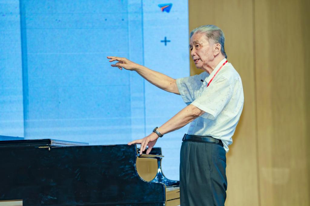 最后,由舒泽池先生作了题为《调性视唱的优势与实施方法》的精彩讲座。舒先生今年81岁高龄,90分钟的讲座除弹奏钢琴之外,几乎全程站在讲台上为大家娓娓道来,把几十年来积累的音乐教学和实践经验分享给大家。他逻辑清晰、精益求精、由浅入深的讲述调性音乐的发展历程以及调性视唱的优势和实施方法。言与行一致为人师表,教与行相长与时俱进。舒老的专业学识和奉献精神,赢得在场所有专家学者和参会师生的尊重。