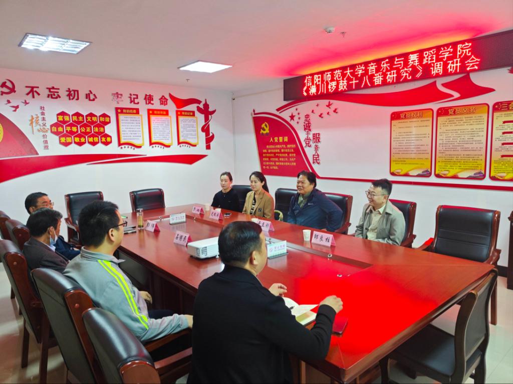 于立刚一行首先拜访了潢川县著名民间锣鼓艺术传承人石保民,并参加了潢川县文广新局举办的《潢川锣鼓十八番》调研会。县文广旅局局长谢磊,副局长彭伟,县文化馆馆长王新伟出席会议,双方就《锣鼓十八番》艺术文化相关问题进行了深入交流。