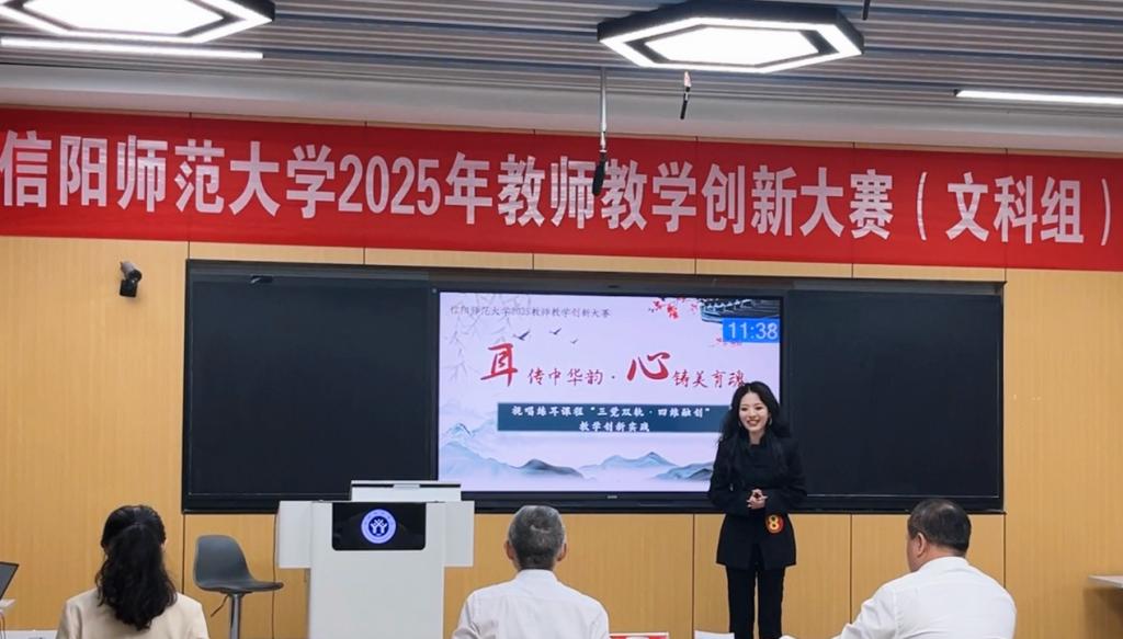 决赛现场,刘佳蕾老师从教学痛点分析、创新路径设计到改革成效验证,系统展示了《视唱练耳》课程的全方位革新。她生动呈现了学生从“基础薄弱”到“高阶思维显现”的成长轨迹,并重点阐释了课程思政与文化传承的深度融合。