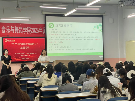活动伊始,由负责人组织同学们有序落座。活动形式以讲解PPT和观看诚信教育的宣传片进行。宣传片以诚信贷款为主要内容,引导同学们珍爱信用、理性贷款、增强学生征信意识、风险意识以及法律意识,增强同学们的责任感,帮助他们树立正确的消费观、价值观,引导学生们理性消费、珍视诚信,远离不良“校园贷”。最后由活动负责人对本次活动进行总结,组织同学们有序离场。