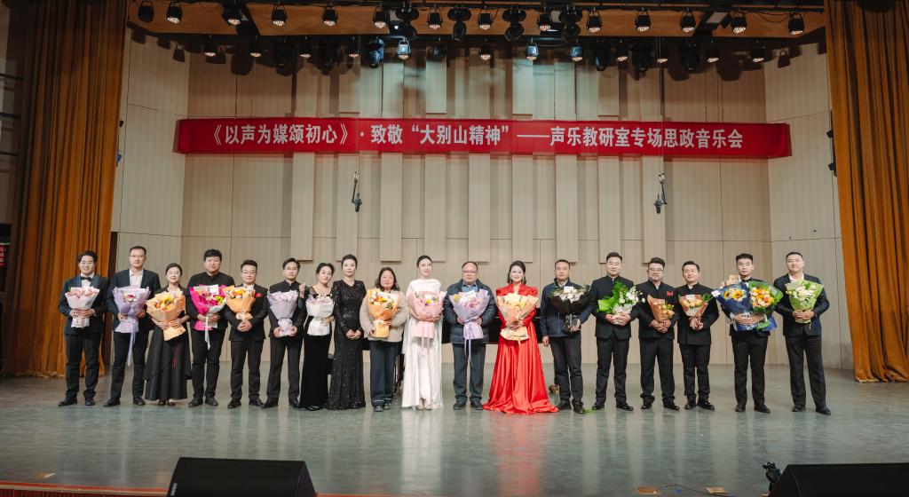为传承红色基因,弘扬大别山精神,2025年12月5日,beat365唯一官方网站beat365唯一官方网站声乐教研室“以声为媒颂初心·致敬大别山精神”专场音乐会在艺术楼音乐厅隆重举行。声乐教研室十余位教师联袂登台,以一场高水平的红色经典声乐盛宴,为现场师生带来了深刻的思想洗礼与艺术享受。
