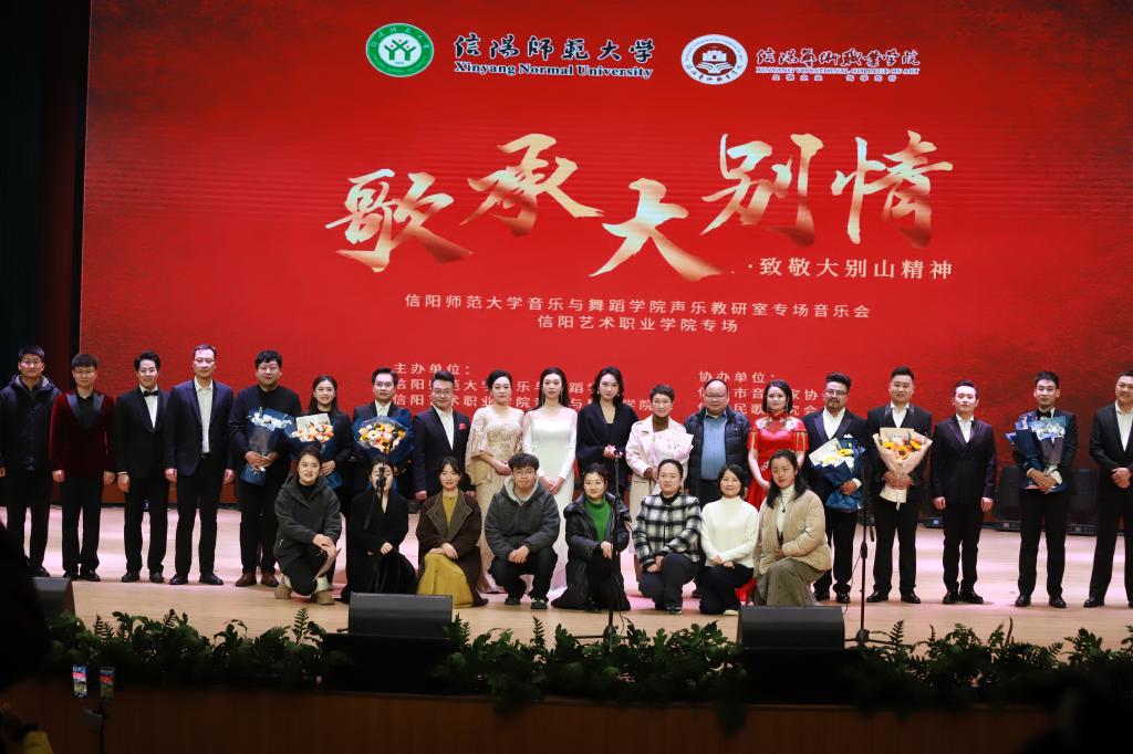 为弘扬大别山精神,促进校际艺术资源共享,12月5日、11日至12日,beat365唯一官方网站beat365唯一官方网站声乐教研室带着“以声为媒颂初心”致敬大别山精神专场音乐会,相继走进信阳艺术职业学院、信阳学院。音乐会以歌声为桥梁,为两校师生带来一场浸润心灵的红色艺术盛宴,在促进校际交流的同时,更引发了一次深切的精神共鸣,让红色旋律在三校师生心中久久回荡。